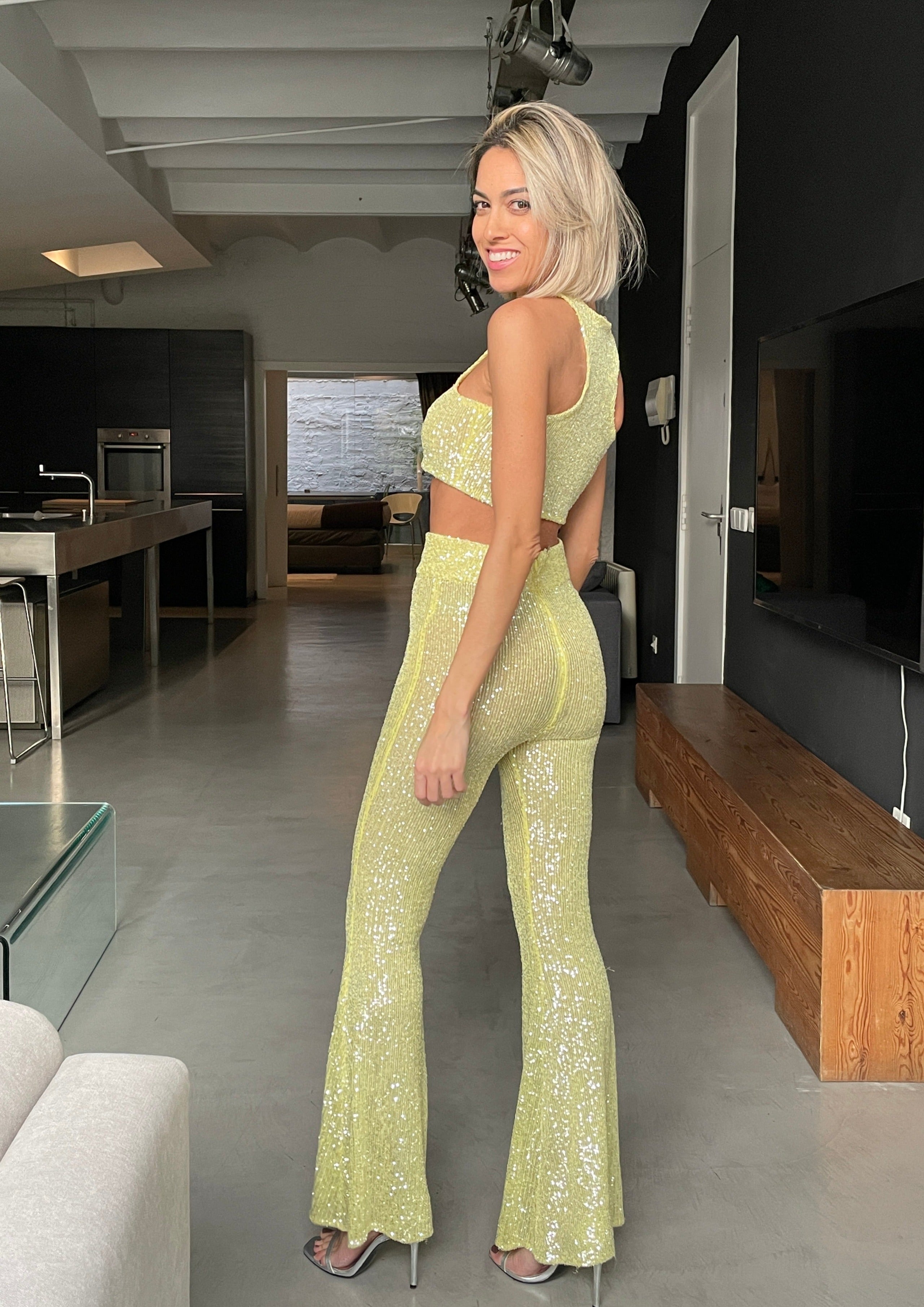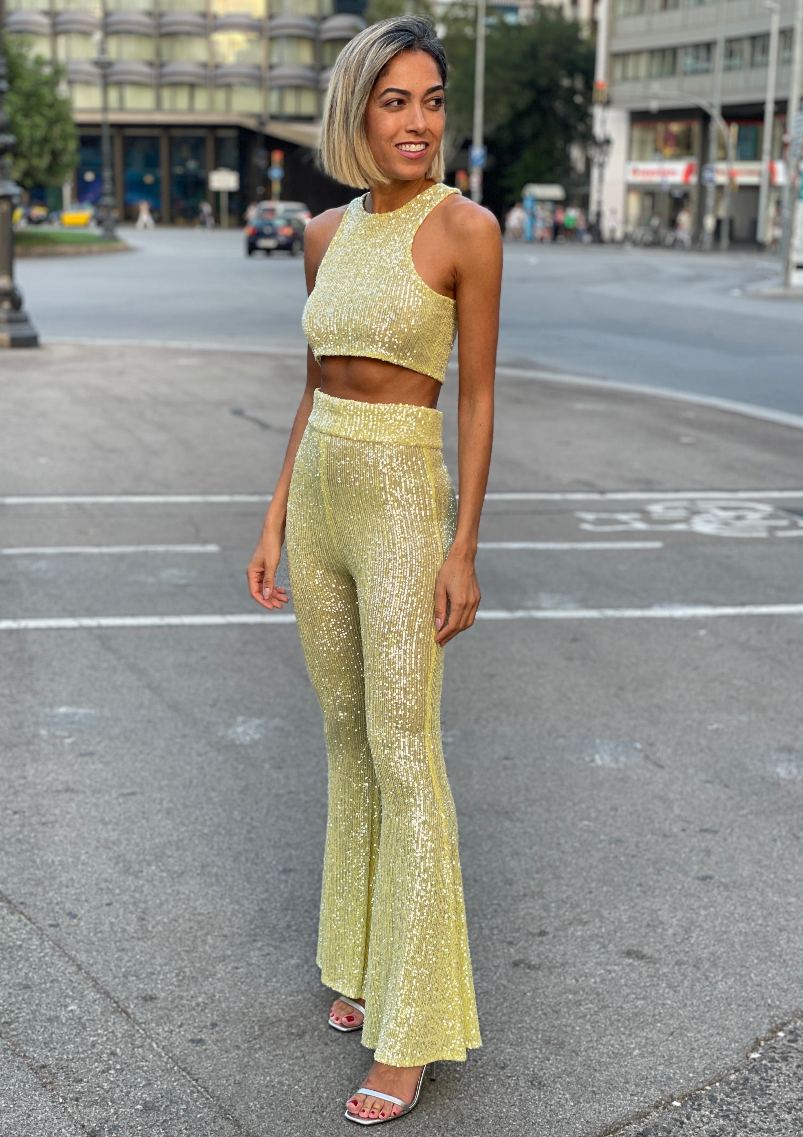 Es el conjunto más glamuroso de la temporada, compuesto por un pantalón acampanado con cremallera y un top cropped estilo nadador. No lleva forro, lo que permite apreciar una sutil y elegante transparencia.