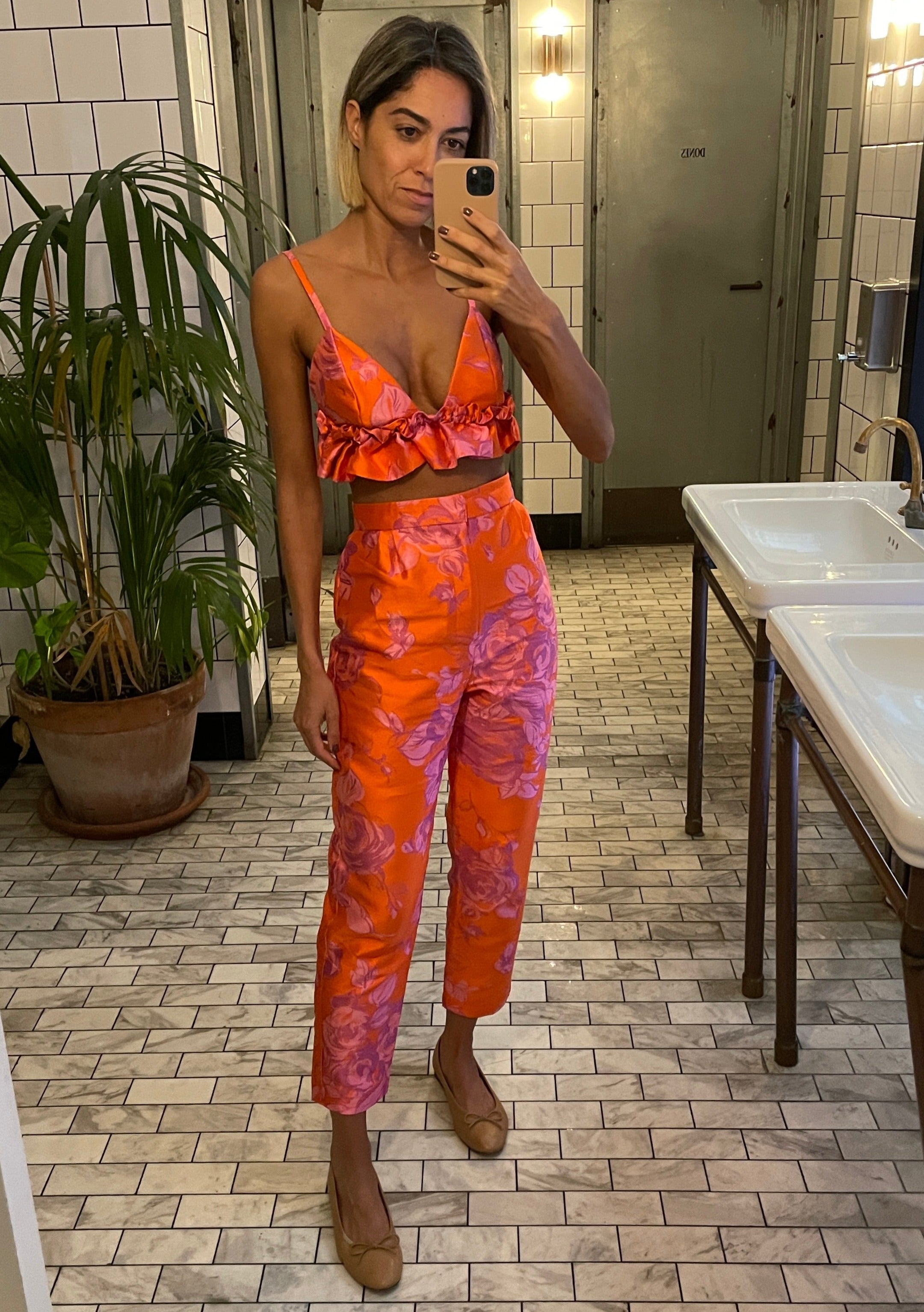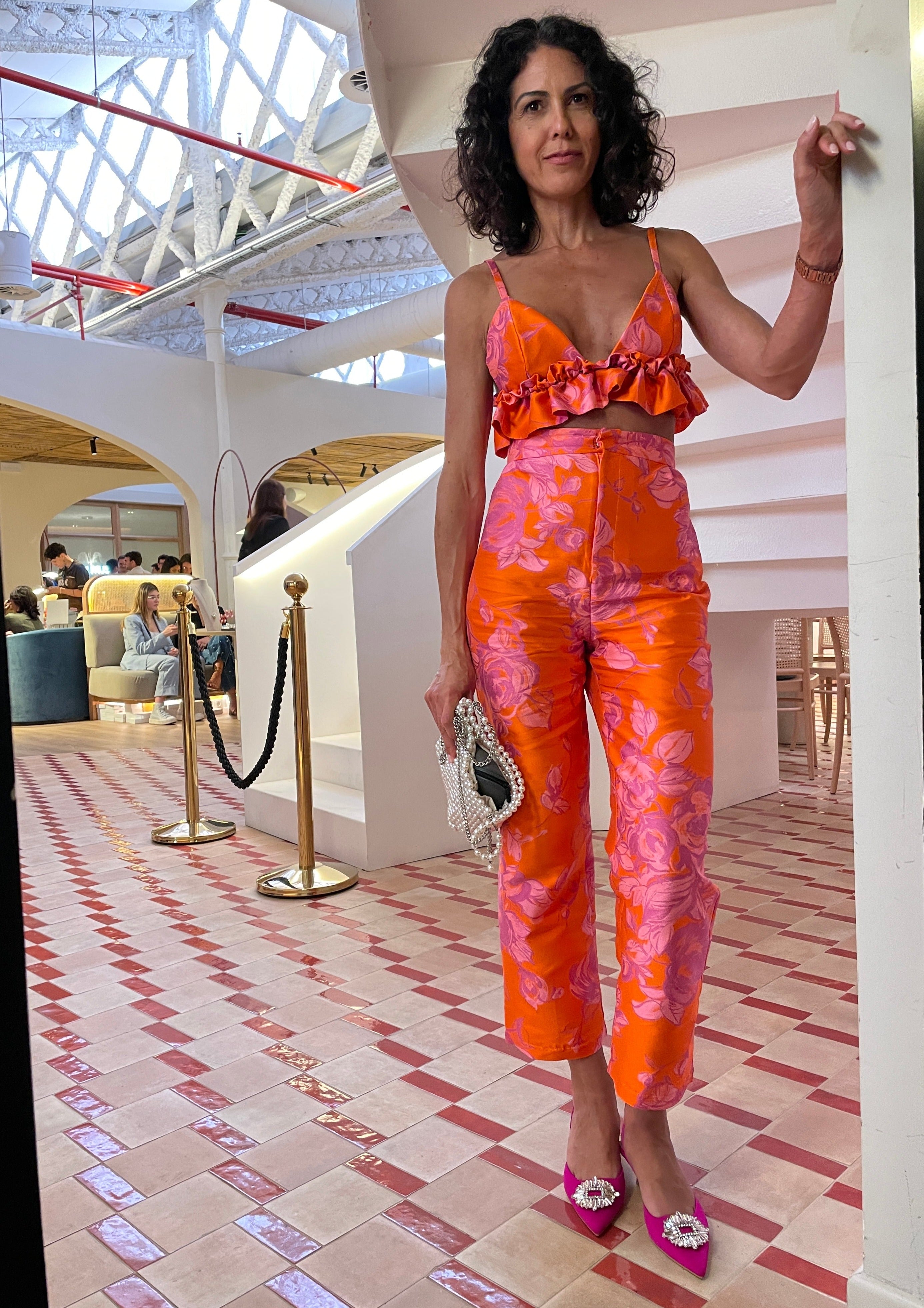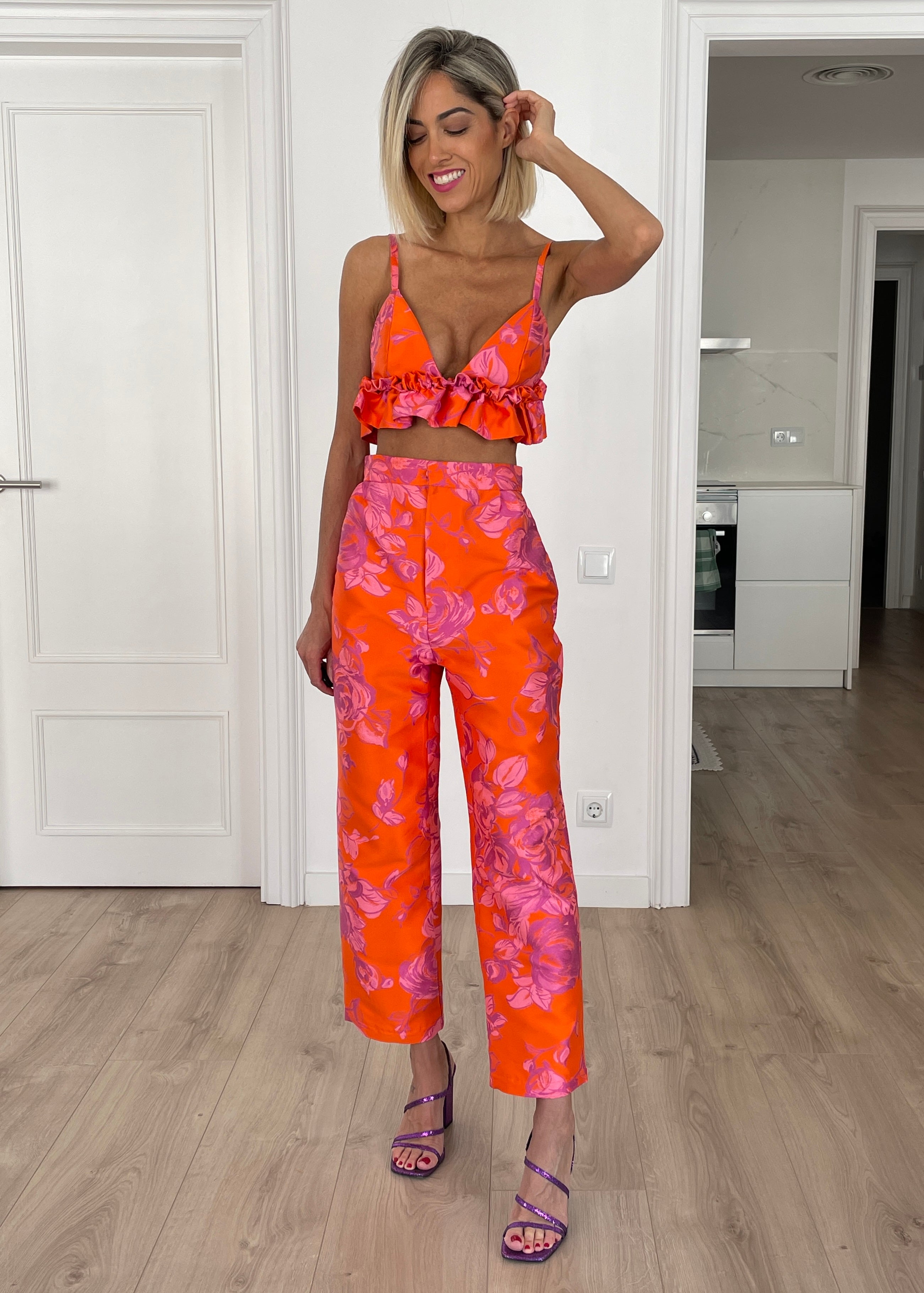 Ideal para el día con sandalias planas o para la noche con tacones. El conjunto Antonia está compuesto por un pantalón de pinzas recto y un top con volantes, con elástico y cierre con un delicado botón, todo confeccionado en una preciosa tela jacquard.