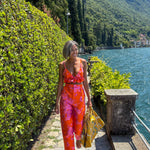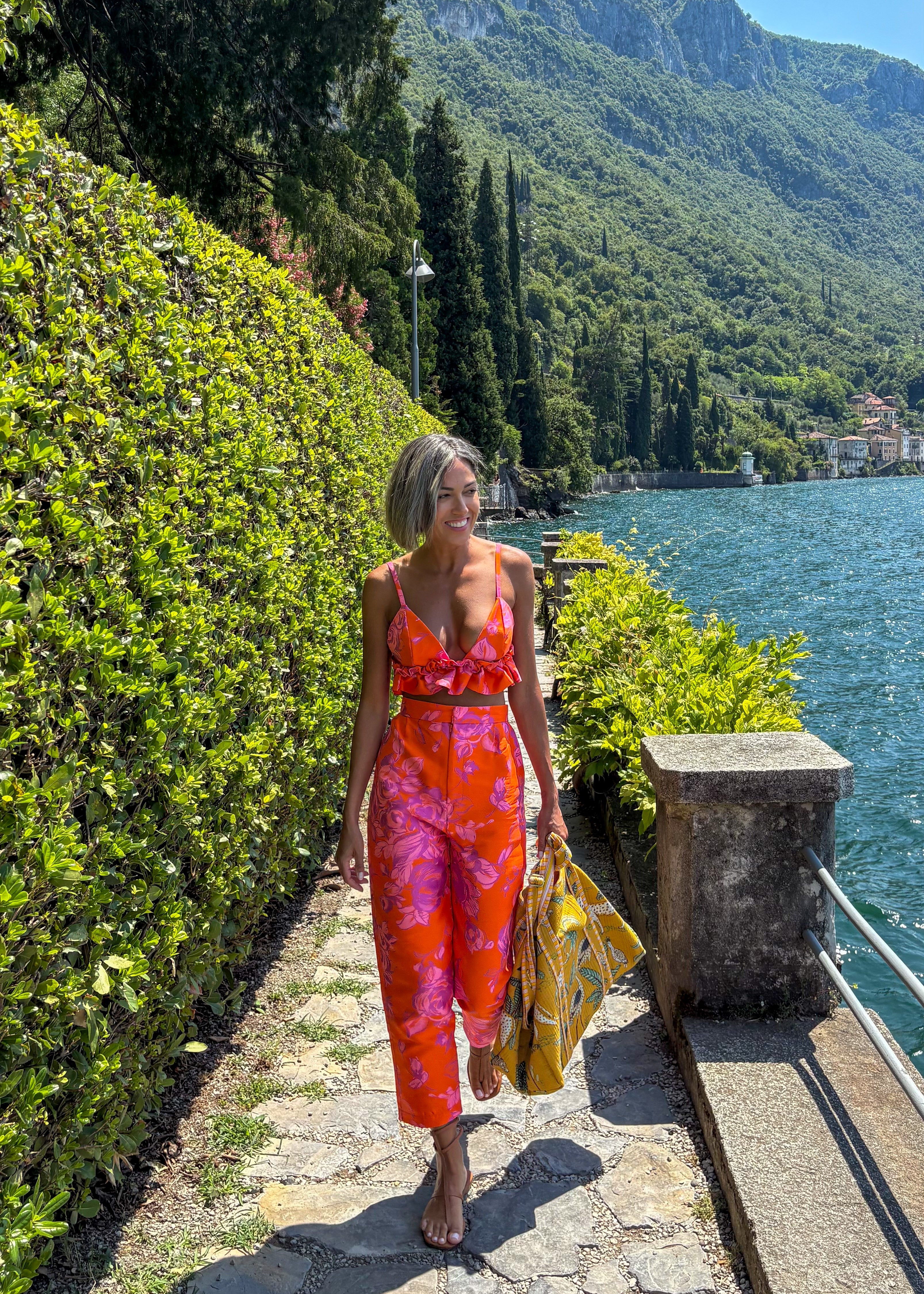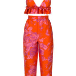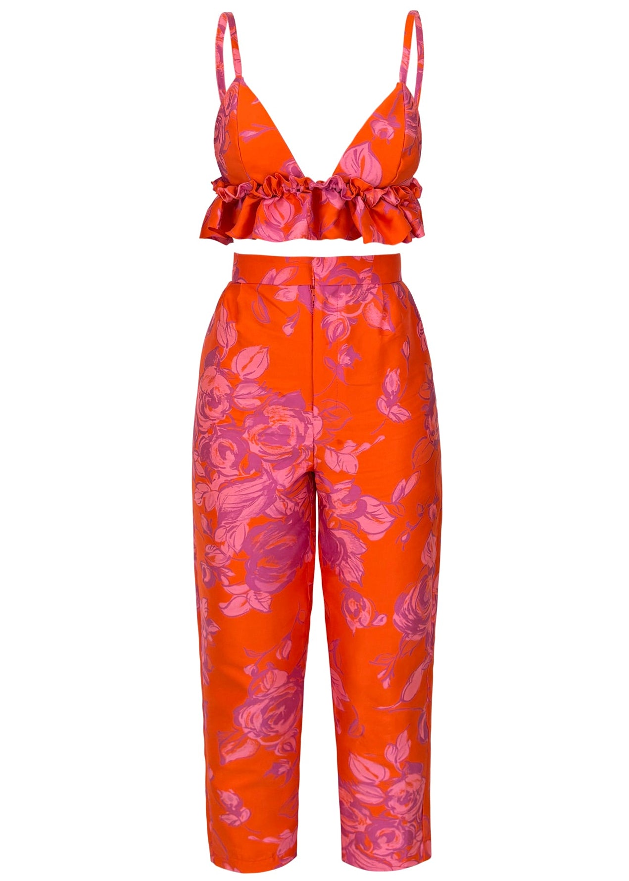 Este conjunto se compone de un pantalón de pinzas de corte recto y un top con detalle de volantes, cinturilla elástica y cierre con botón delicado, todo confeccionado en jacquard de textura sublime y peso ligero.
