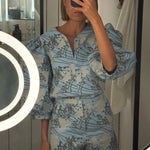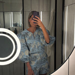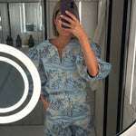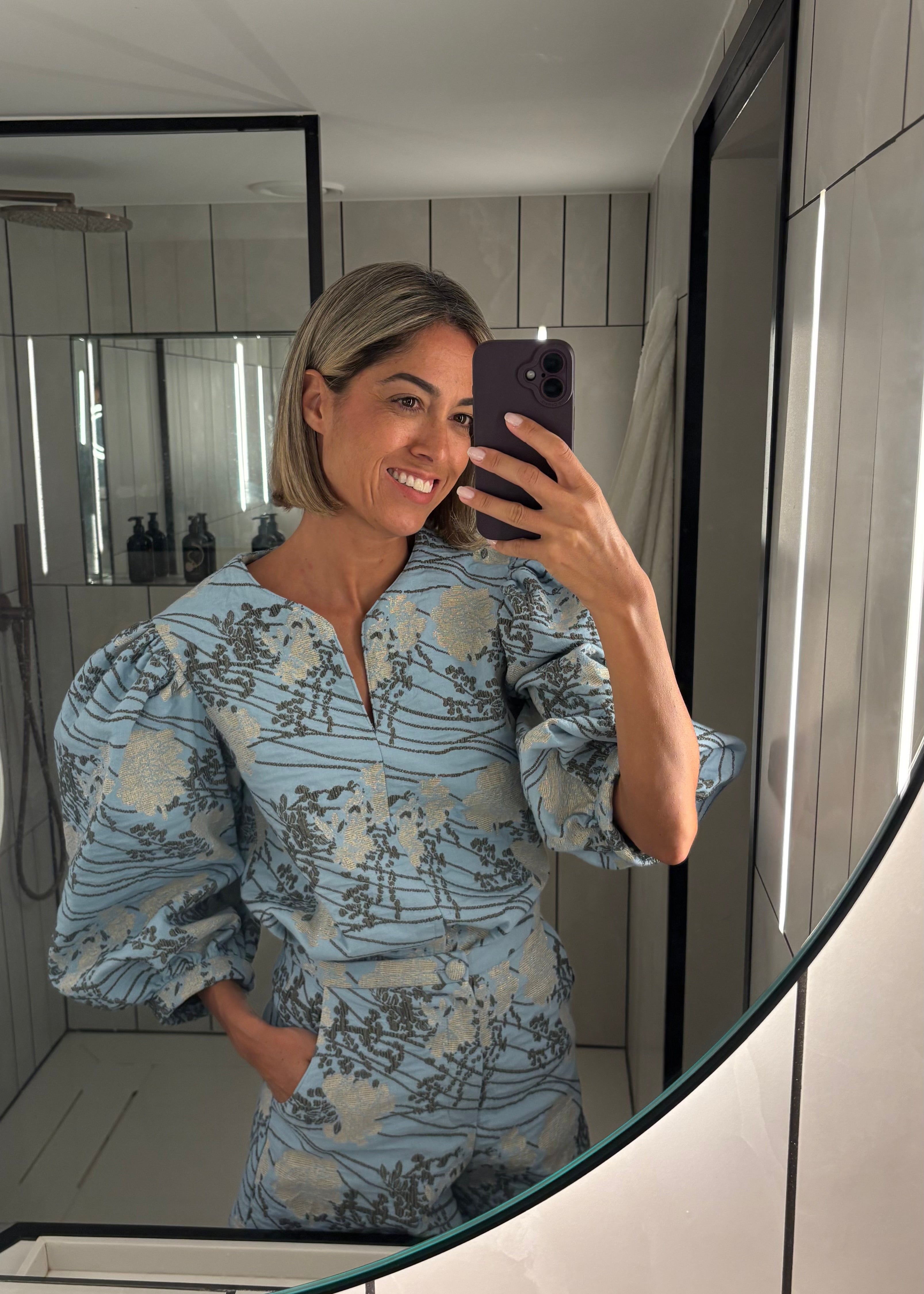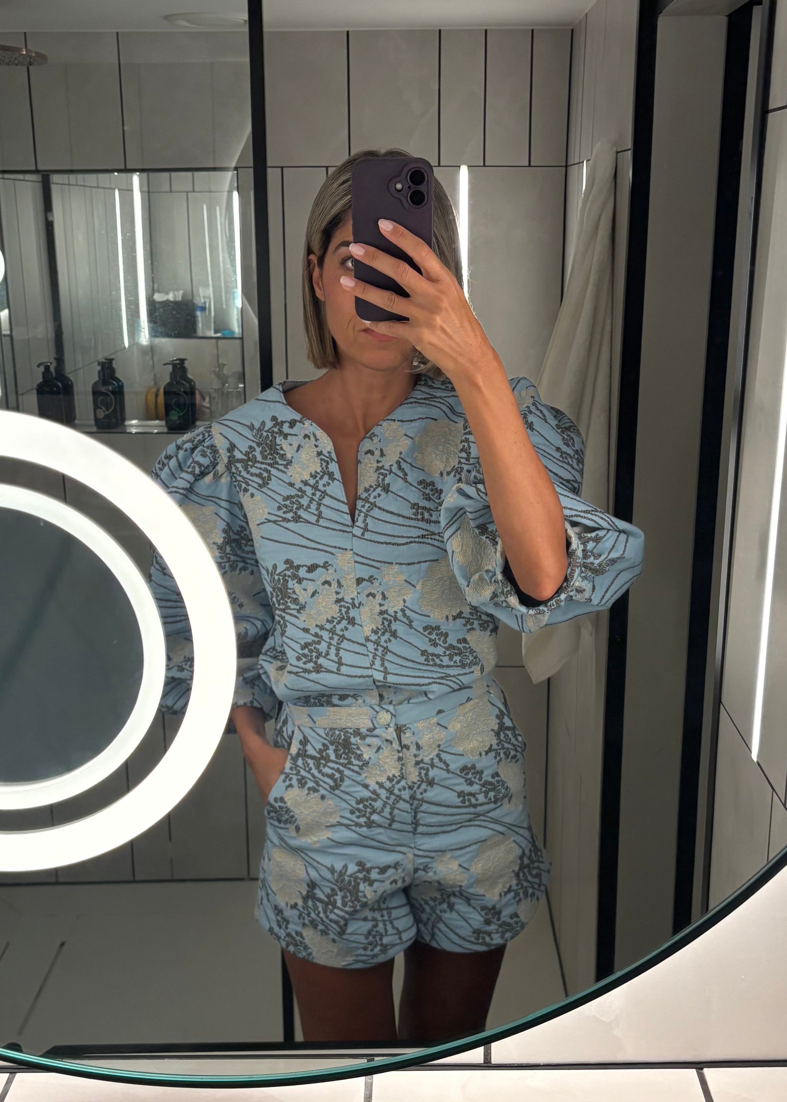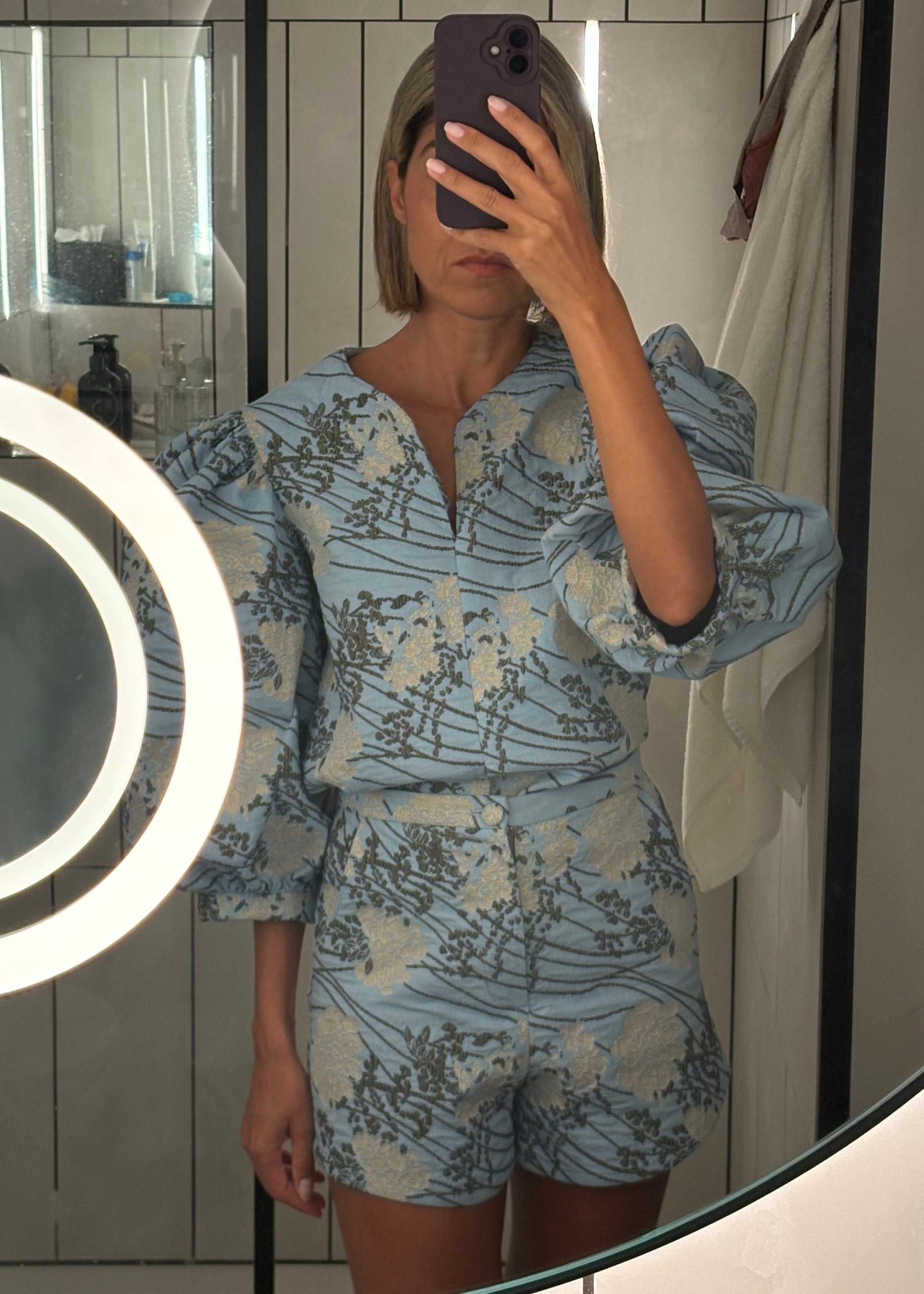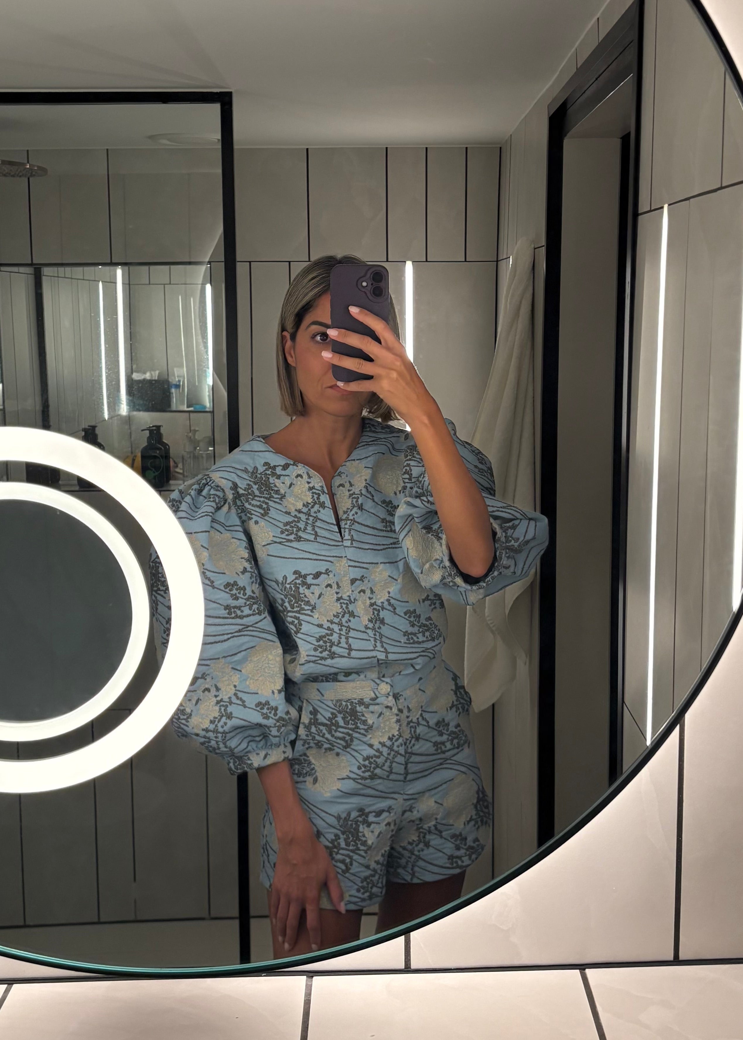 La tela, un jacquard lamé con motivos florales en azul claro y gris, añade textura y un brillo sutil que lo convierten en un conjunto tan versátil como especial. Emilia es esa elección perfecta que funciona tanto en eventos, cumpleaños, comidas o cenas, como en looks para el día a día.