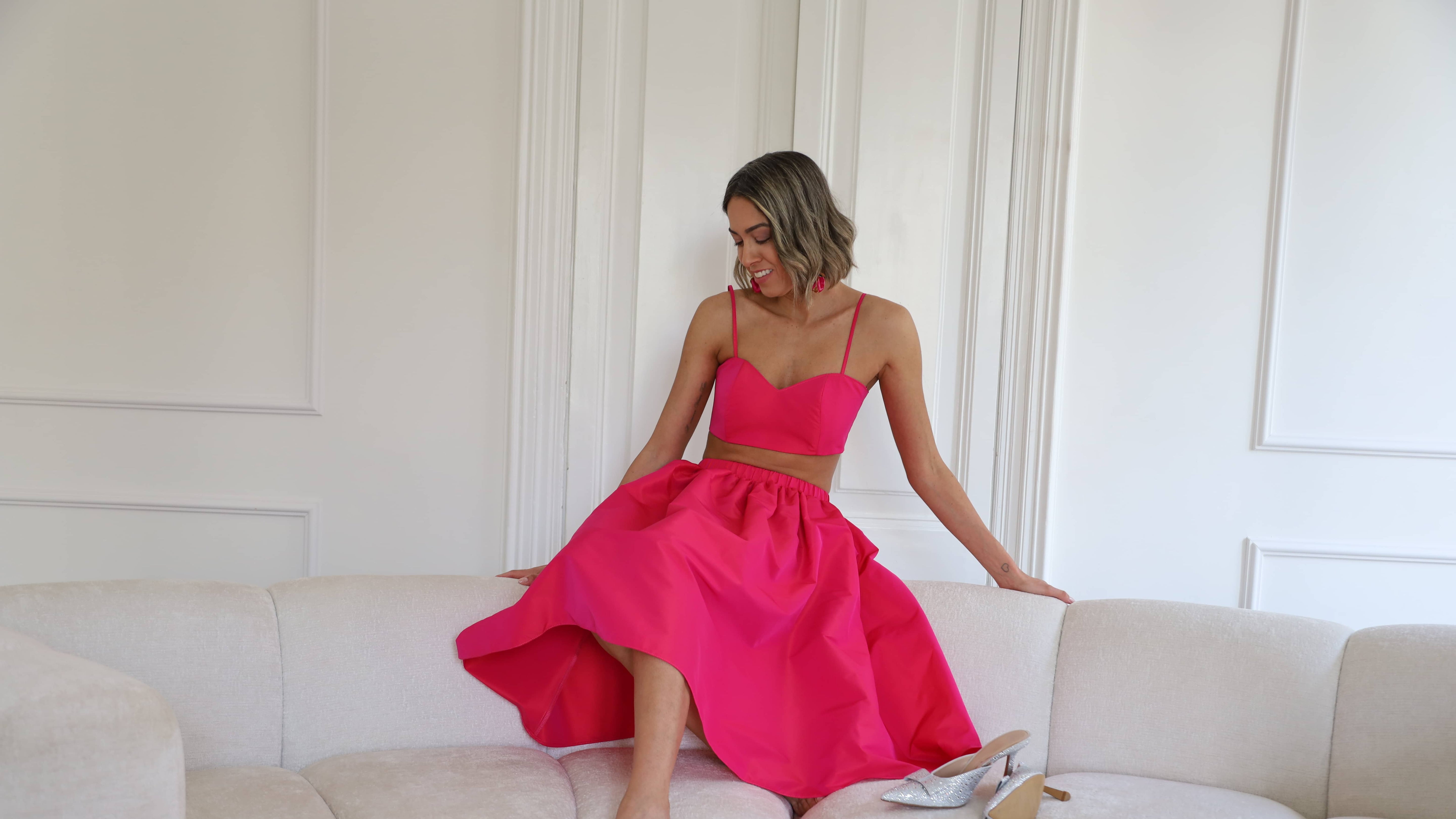 Confeccionado en tafetán fucsia, un tejido con cuerpo y un brillo espectacular.