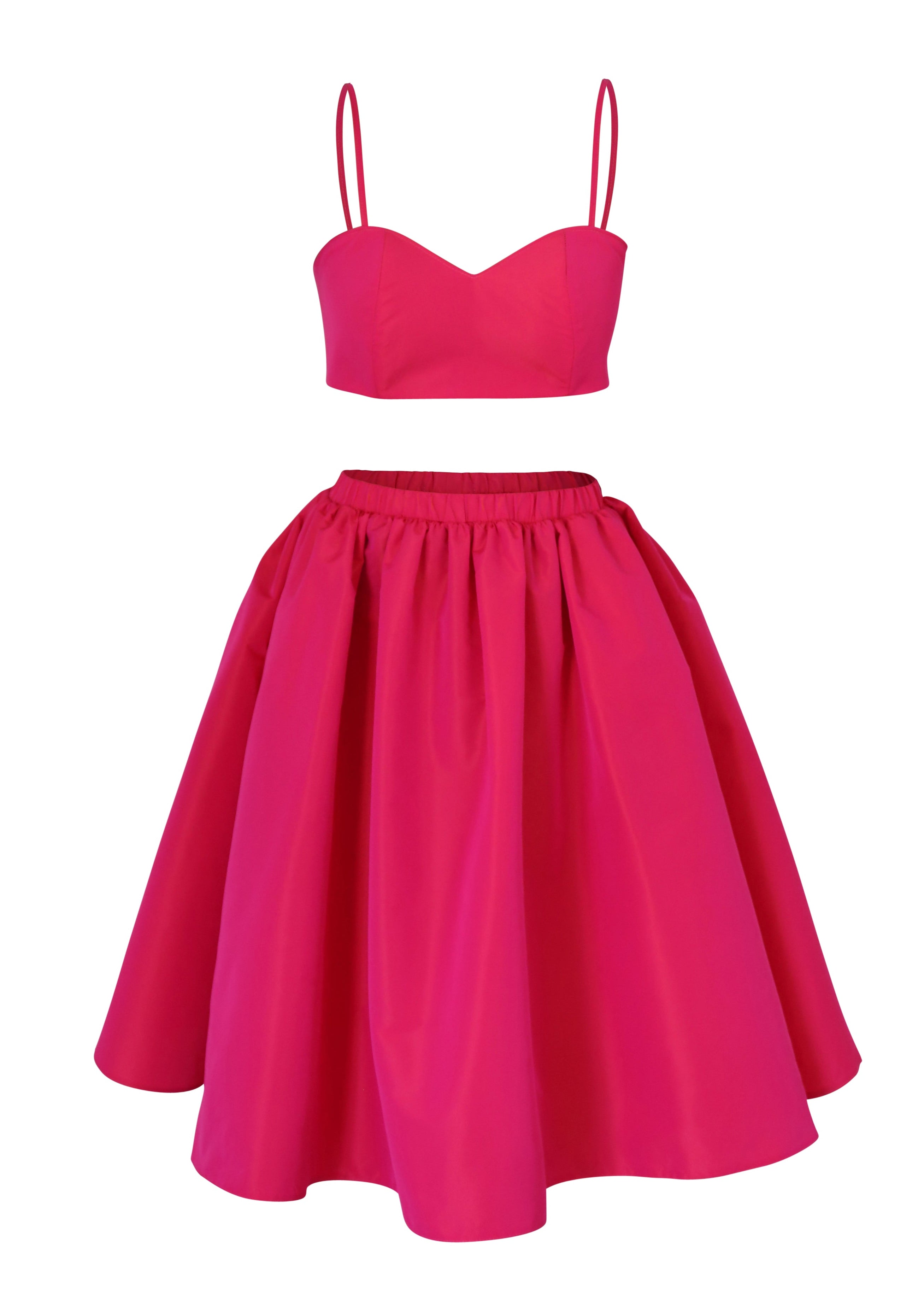 El conjunto Giulia es pura magia contemporánea. Consta de un top estructurado y una falda godet midi, creando una silueta elegante, femenina y llena de movimiento.