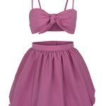 La falda corta tipo globo realza la cintura y crea un efecto estructurado y coqueto, mientras que el top cropped con lazada delantera ajustable aporta un toque moderno y versátil que permite adaptar el look a diferentes estilos.