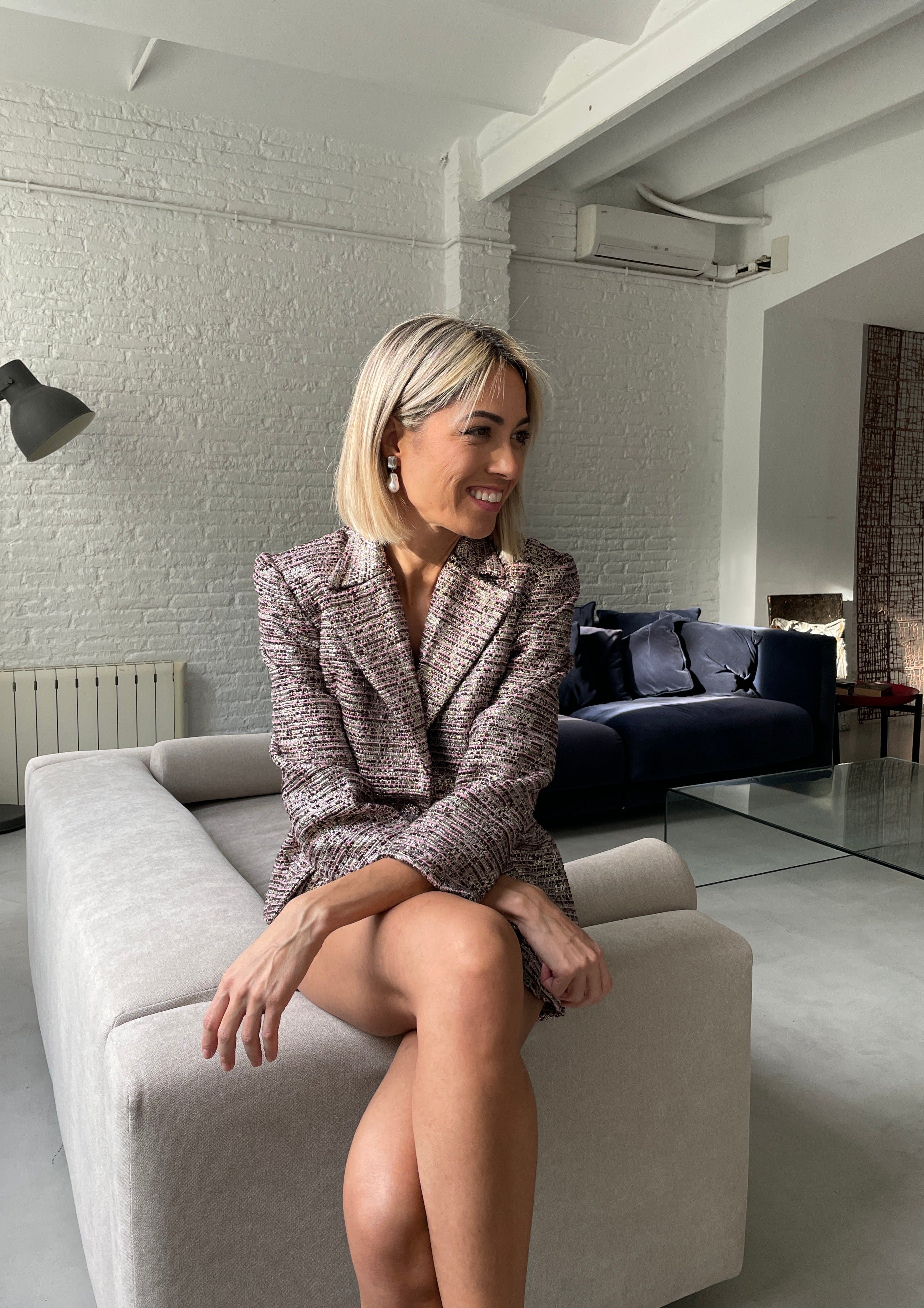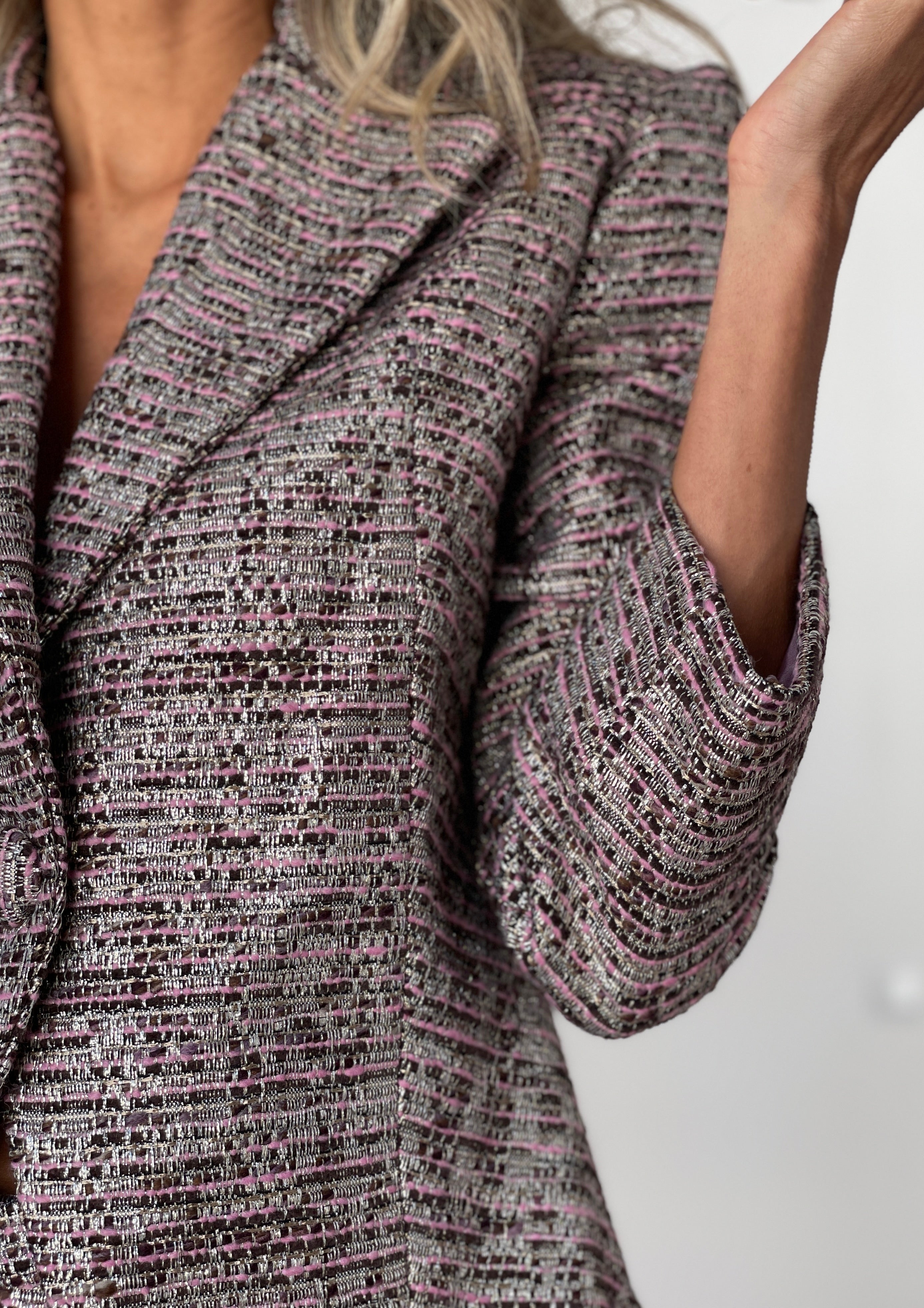 La tela de tweed en rosa, negro y plata es realmente impresionante y le da un toque sofisticado a este traje.