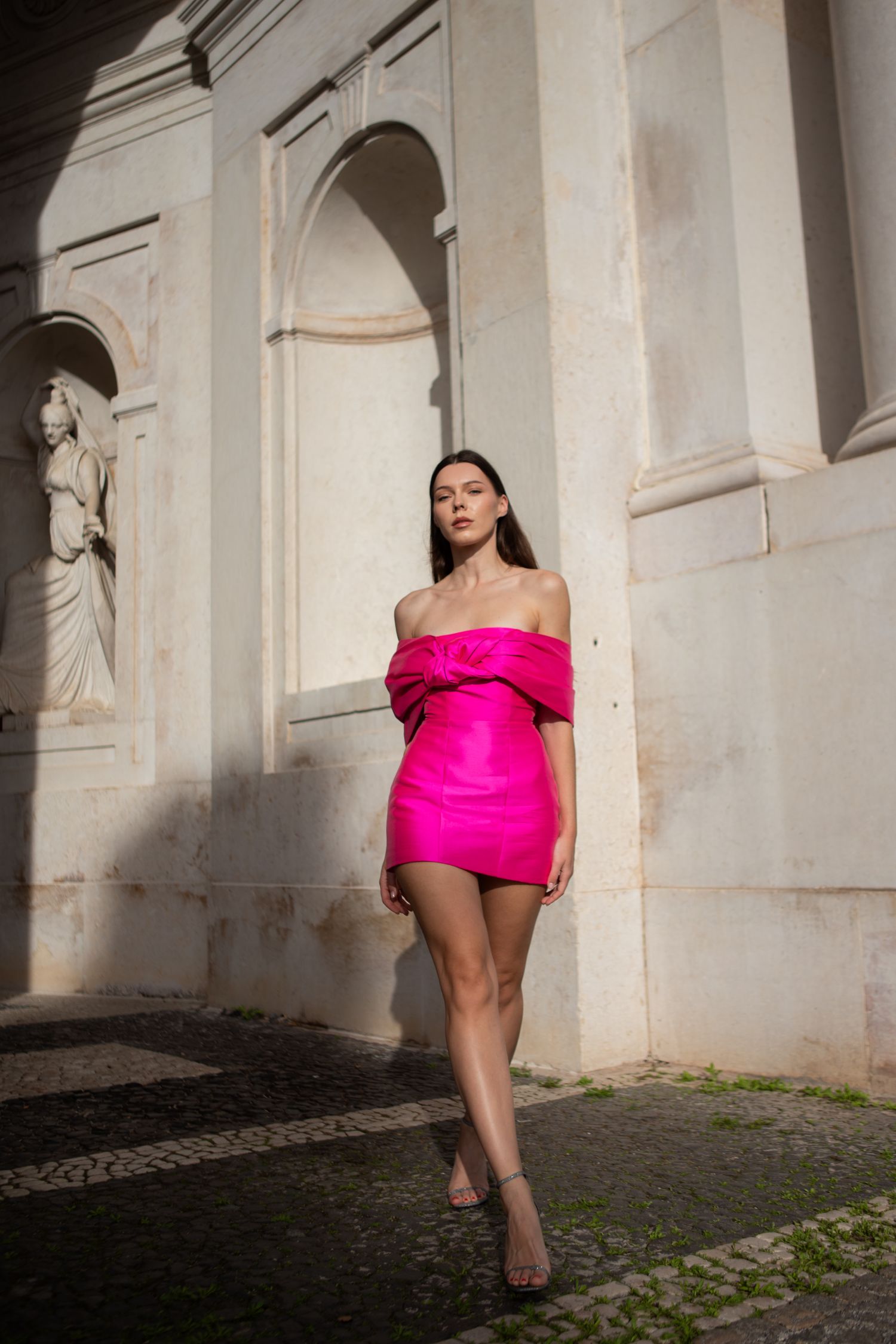 En un llamativo color rosa fucsia, este vestido corto es la elección perfecta para aquellas que buscan destacar con estilo. El detalle del gran lazo en el escote agrega un toque de sofisticación, mientras que la tela de mikado de alta calidad garantiza una elegancia incomparable en cualquier ocasión especial.