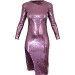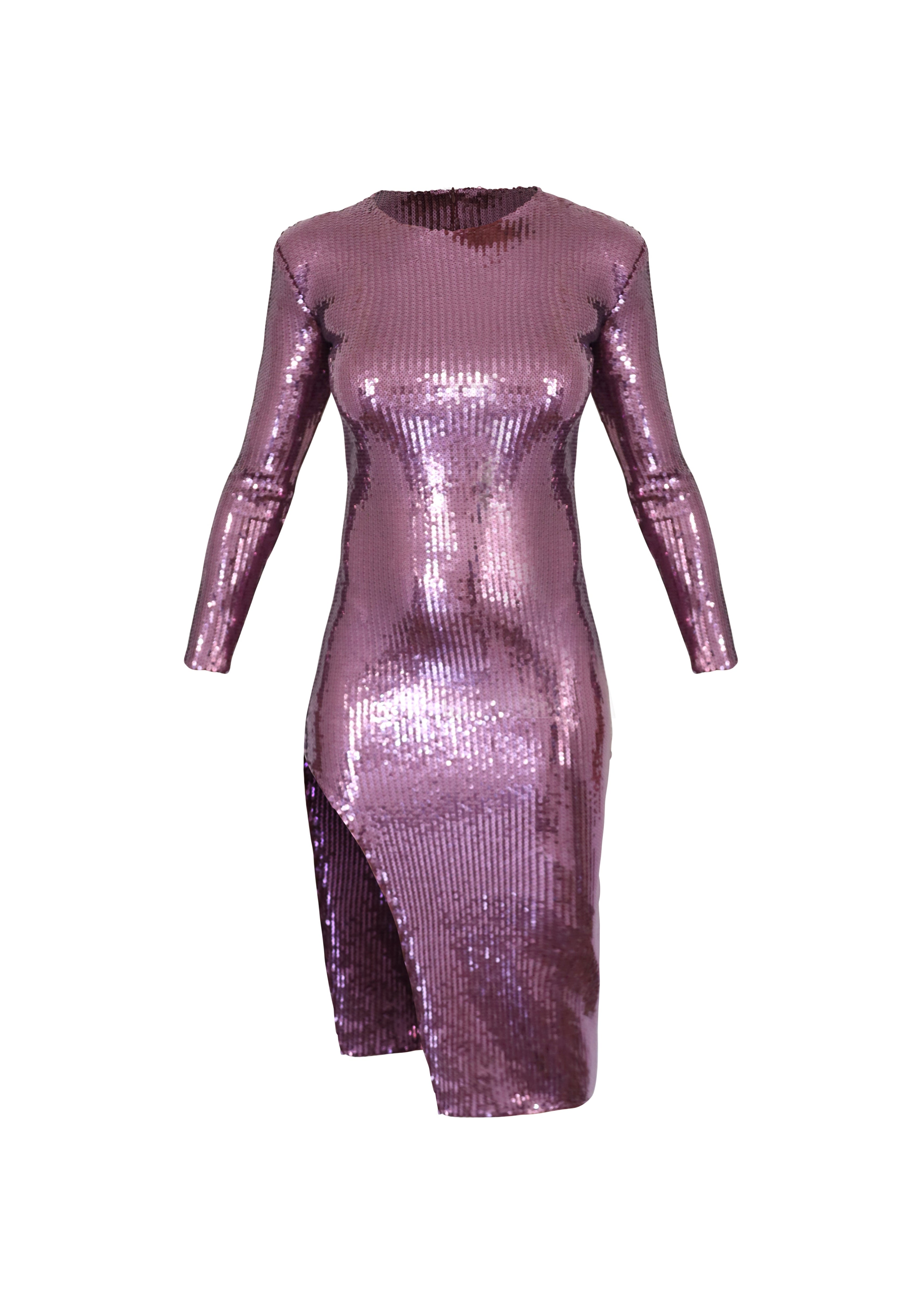 Deslumbra con el vestido Nicoletta, un diseño midi de lentejuelas con mangas largas que combina glamour y elegancia con una comodidad excepcional gracias a su tejido con elastán.