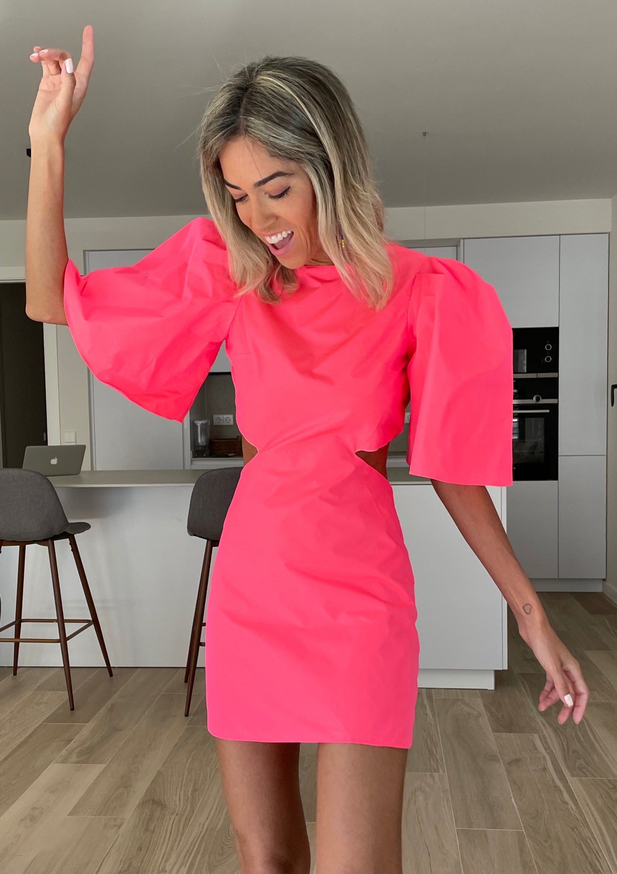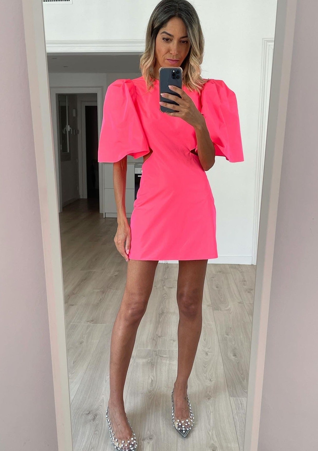 Este vestido es ideal para el verano, en un hermoso color rosa tornasol y tela de tafetán de alta calidad.